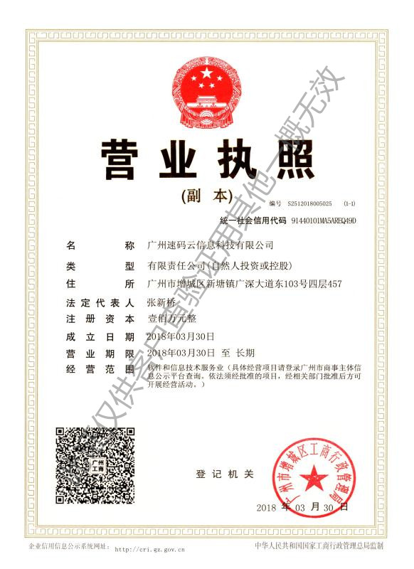 尊敬的客戶,歡迎瀏覽我公司資質,我公司簡稱(速碼云信息)前身是:(廣州互成通信科技有限公司)因公司發展現在成立《速碼云信息》公司合作運營,給你帶來不便,望諒解!
